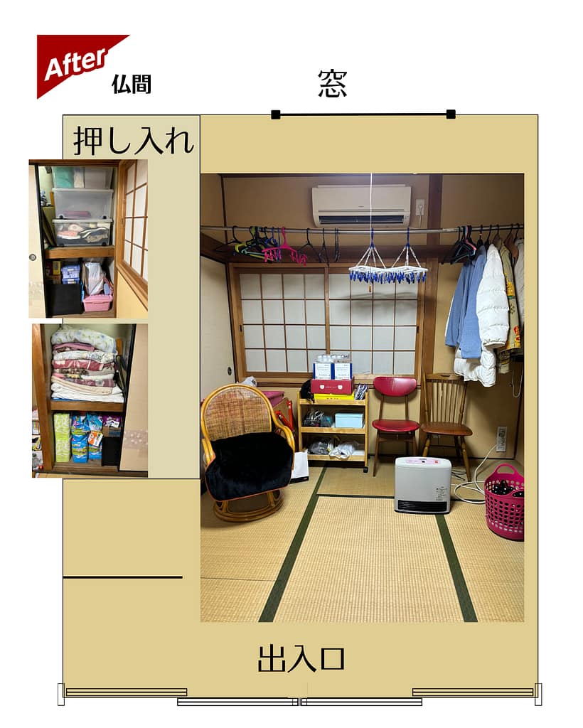 窓の手前まで色々なモノが置かれていましたが整理した事で、外に出ていたモノを押し入れに収納する事ができました。